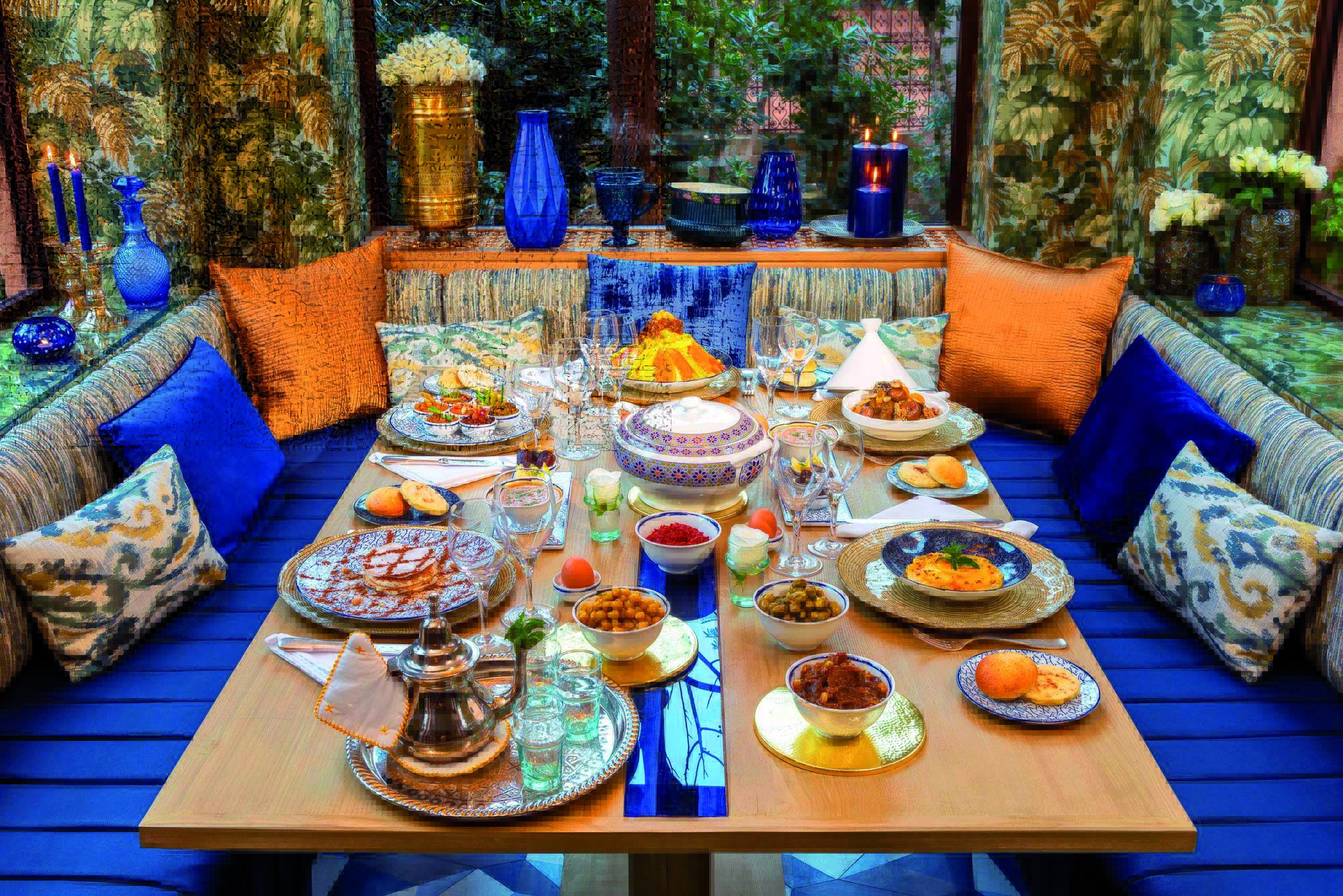 Le Tigmiza s’est imposé au fil du temps comme le boutique-hôtel de luxe référence de la Ville rouge avec un seul mot d’ordre : offrir à ses hôtes un séjour sur-mesure au cœur de Bab Atlas dans la Palmeraie de Marrakech. Le restaurant s’appelle le Lallati, -abréviation de Lalla Tigmiza, la Maison d’Izza en berbère. Mobilier design, vaisselle « tendance » où les bleus se marient aux ors sous un plafond ancien enrichi d’une authentique œuvre d’art typiquement berbère… Le ton est donné, la soirée s’annonce poétique sous la lumière des lanternes, entre le bruissement de la fontaine et la musique traditionnelle du maitre gnaoua. Tout aussi poétiques, les formules déjeuner-piscine qui rendent hommage aux « Dadas », ces femmes qui transmettent, de génération en génération, les secrets et traditions de la cuisine marocaine. Aux fourneaux, entouré de Habiba et Amina, le chef Mohamed Bouhou, un fervent défenseur du patrimoine culinaire marocain : « Je propose une expérience sensorielle chargée d’émotions, dit-il, une cuisine de partage, des recettes authentiques, des assiettes à la fois belles et gourmandes, au caractère savoureux et épicé… » Très convoité aussi pour les mariages et autres événements, le Colisée, l’espace paysager de plus de 6.000 m2 dont mille sont couverts d’une immense verrière, peut accueillir jusqu’à quatre cents personnes. « Le Tigmiza, c’est toute une histoire de passion familiale, assure Maria Laraqui, la fille cadette de la famille. Nos hôtes sont ici accueillis en amis, comme à la maison… » De l’élaboration des menus au choix de la décoration, en passant par le conseil en animation artistique, l’équipe du Tigmiza prend en charge toute l’organisation d’un événement qui devient forcément unique. Par la qualité de ses services et le charme unique de son site au cœur de la palmeraie, Le Colisée de Tigmiza s’impose déjà comme le must événementiel à Marrakech.