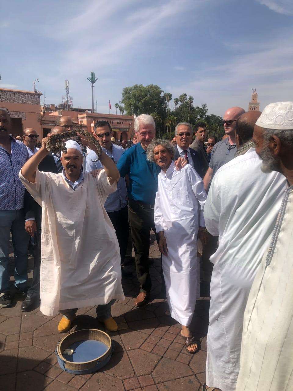 En attendant le grand jour, Bill Clinton s’est offert, comme à l’accoutumée, une petite balade sur la Place Jemaa el Fna, où il a pris la pause avec les charmeurs de serpents et les vendeurs des échoppes, comme un vrai touriste lambda, même si le protocole de sécurité était au rendez-vous.