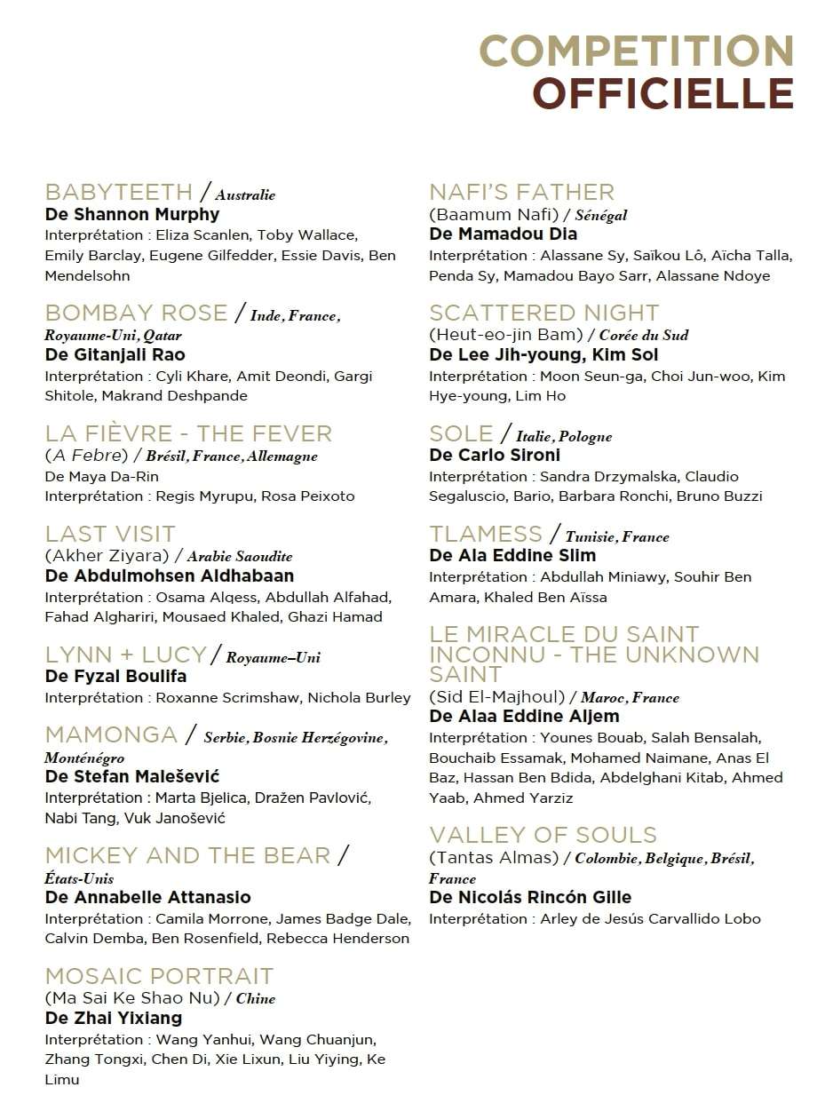 La compétition officielle reste fidèle au positionnement du Festival : montrer des premiers ou seconds longs métrages afin de révéler et de promouvoir les nouveaux talents du cinéma mondial. En ouverture, les festivaliers ont rendez-vous avec un grand thriller américain : «À couteaux tirés». Les séances de gala présenteront, quant à elles, des avant-premières de cinéastes respectés à l’image de «Marriage Story» de Noah Baumbach (États-Unis), «The Irishman» de Martin Scorsese (États-Unis), et «It Must Be Heaven» d’Elia Suleiman (Palestine).