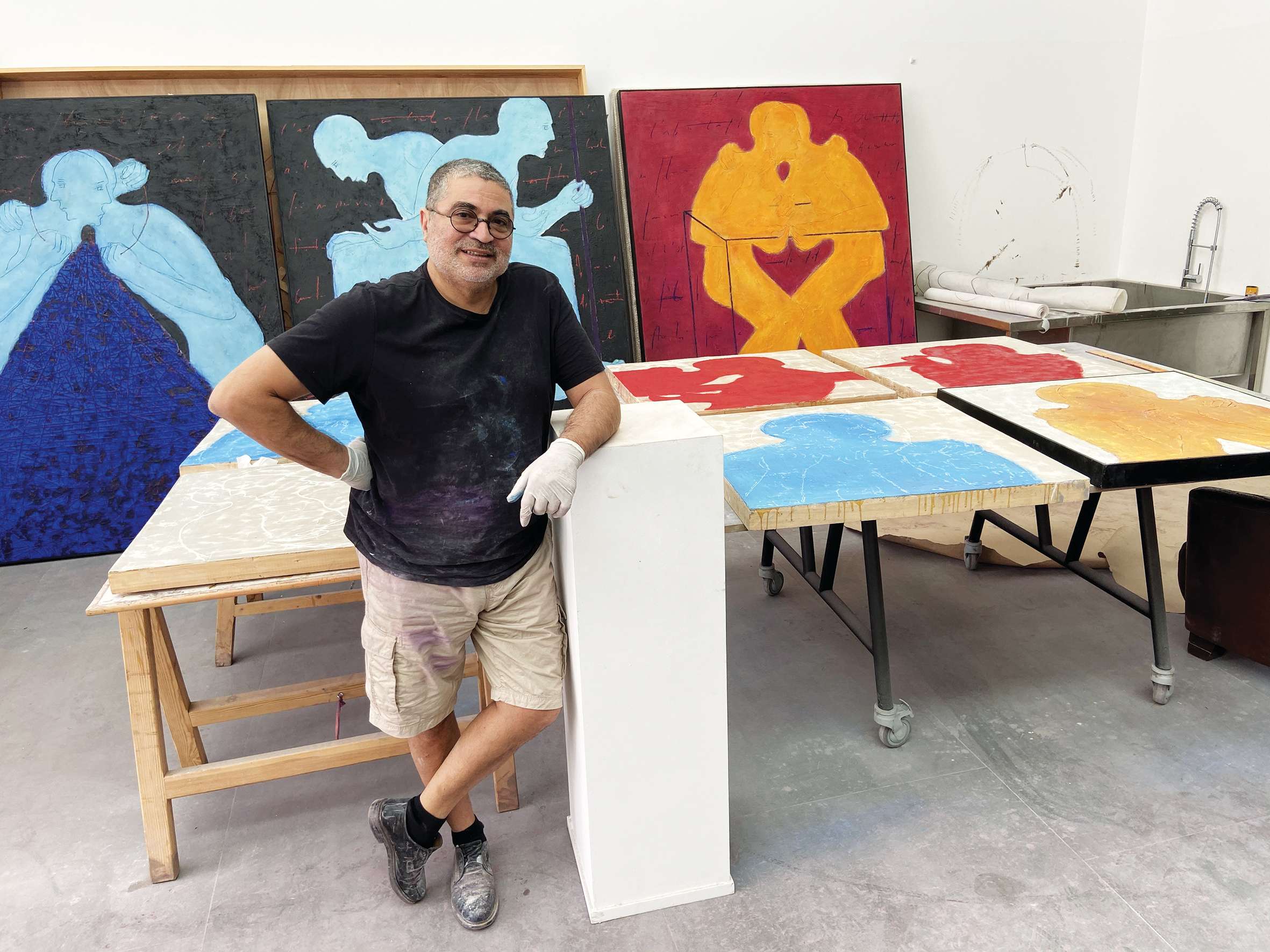 Après avoir sillonné plusieurs pays, Mahi Binebine a renoué avec sa ville natale, où il s’est installé depuis 2002. “J’ai fait le bon choix en reposant mes valises dans la ville qui m’a vu naître. Marrakech m’offre un panel de matières premières, dont la cire d’abeille, mais surtout des pigments sublimes tel que le bleu outremer, communément appelé bleu Majorelle”. Après quatorze ans de cohabitation artistique avec son acolyte Mohamed Mourabiti au sein de la résidence Al Maqam à Tahannaout, Mahi Binebine s’est installé, pour des raisons pratiques, dans son nouvel atelier non loin de Bab Atlas. “Les idées fusent constamment dans ma tête. Le travail est mon carburant, quand je ne travaille pas, je m’ennuie (rires) ! Si vous êtes animé par une passion, le travail est perçu comme un plaisir et non pas une corvée. Quand on aime, on ne compte pas !
